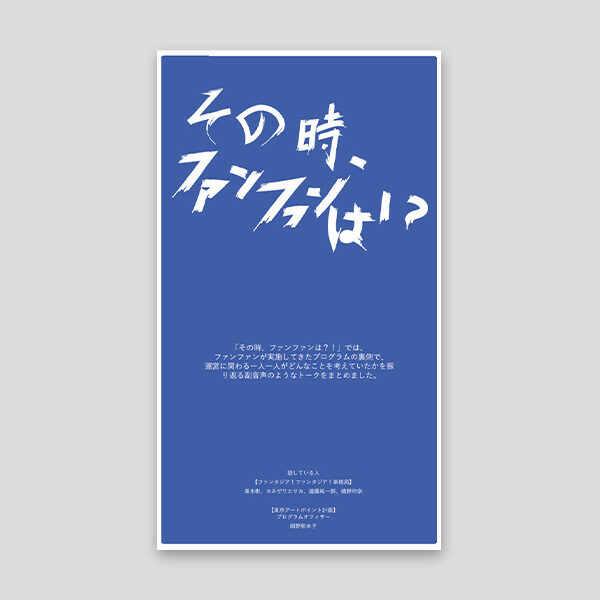 新型コロナウイルス感染拡大の影響により、対面で集まりにくくなった2020年度には、『ファンファンレター』に組み立て式の付録をつけ、近隣飲食店のテイクアウトと連動させたり、「WANDERING」のオンライン版ムービーを制作したりするなどといった「みじかい間、少し遠くまでの対話」を実施。また、事務局内でラジオ番組風にオンラインで情報共有をする「ラジオの時間」を設けるなど、日常のなかでの創造力を忘れず、変化する「日常」や「生活」に柔軟に応答してプロジェクトを継続した。