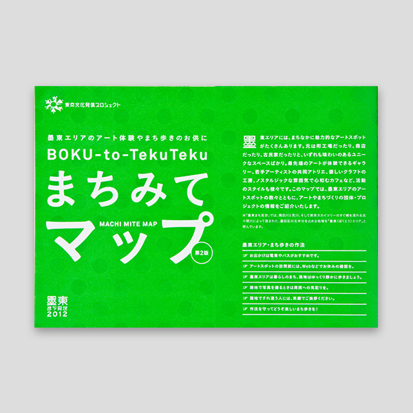 平成24年度まで継続展開した「墨東まち見世」を通して墨東エリアに育まれた、アート拠点やネットワーク資源の持続と定着を目指すプロジェクト「墨東まち見世アートプラットフォーム」で制作したアートマップ。向島エリアに増えつつあるアート拠点を解りやすく紹介するとともに、このエリアで活動する多様なプロジェクトや団体も紹介しています。