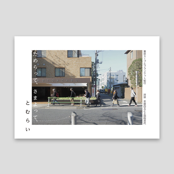 演出家・劇作家の羊屋白玉を中心に、生活圏に起こるものごとの「終焉」と「起源」、そして、それらの間を追求するアートプログラムを展開した「東京スープとブランケット紀行」。 市場の閉場、島民避難の歴史を持つ島…、日々起きている、東京の中の変わり目のその時を「とむらい」ととらえ、活動を行った2015年の記録です。