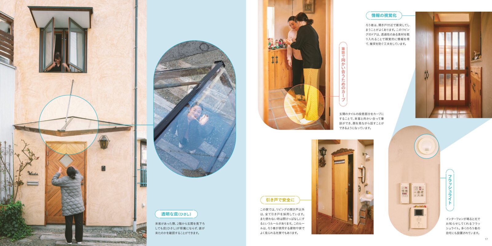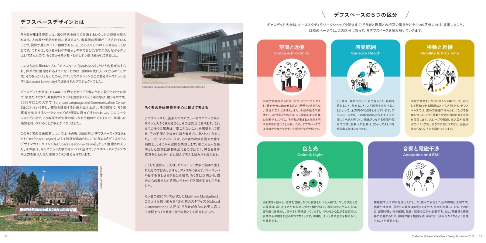本書では、デフスペースの概念を紹介するとともに、リサーチで出会ったさまざまなデフスペースの特長や工夫、めとてラボの実践を、写真やイラストとともに紹介しています。