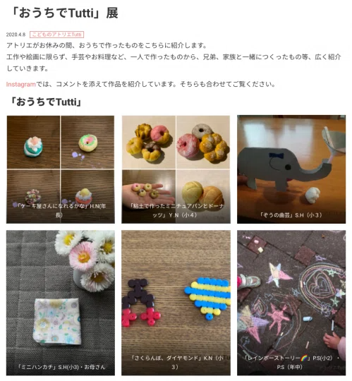 オンライン展覧会「おうちでTutti展」では、アトリエを休止している間、おうちでつくったものを紹介する企画。工作や絵画に限らず、手芸やお料理など、一人で作ったものから、兄弟、家族と一緒につくったものなど、広く紹介されています。