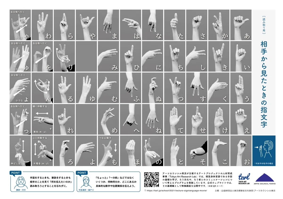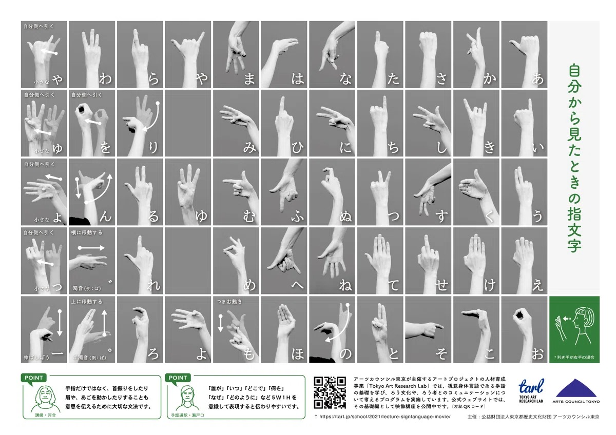 また、2021年冬には2つの指文字表を公開しました。ひとつは「相手から見たときの指文字(読み取り用)」、もうひとつは「自分から見たときの指文字」です。
