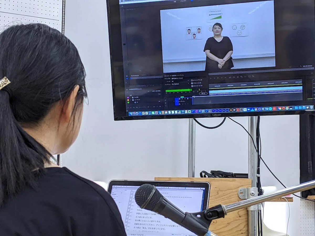 ただし、映像に合わせて原稿をそのまま読み上げるだけではありません。それらを言葉選びや文脈の手がかりにしながら、撮りたての手話映像を見て、2度目の通訳をおこなうイメージで収録します。
