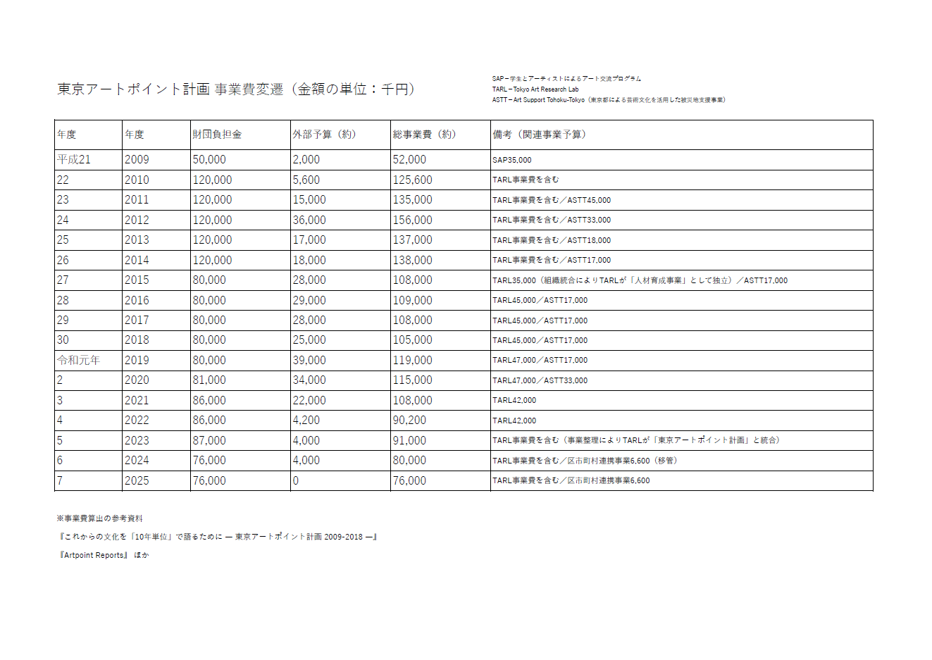東京文化発信プロジェクト室が「アーツカウンシル東京 」と組織統合し、東京アートポイント計画は「芸術文化創造・発信事業」として、TARLは「人材育成事業」として位置づけられた。