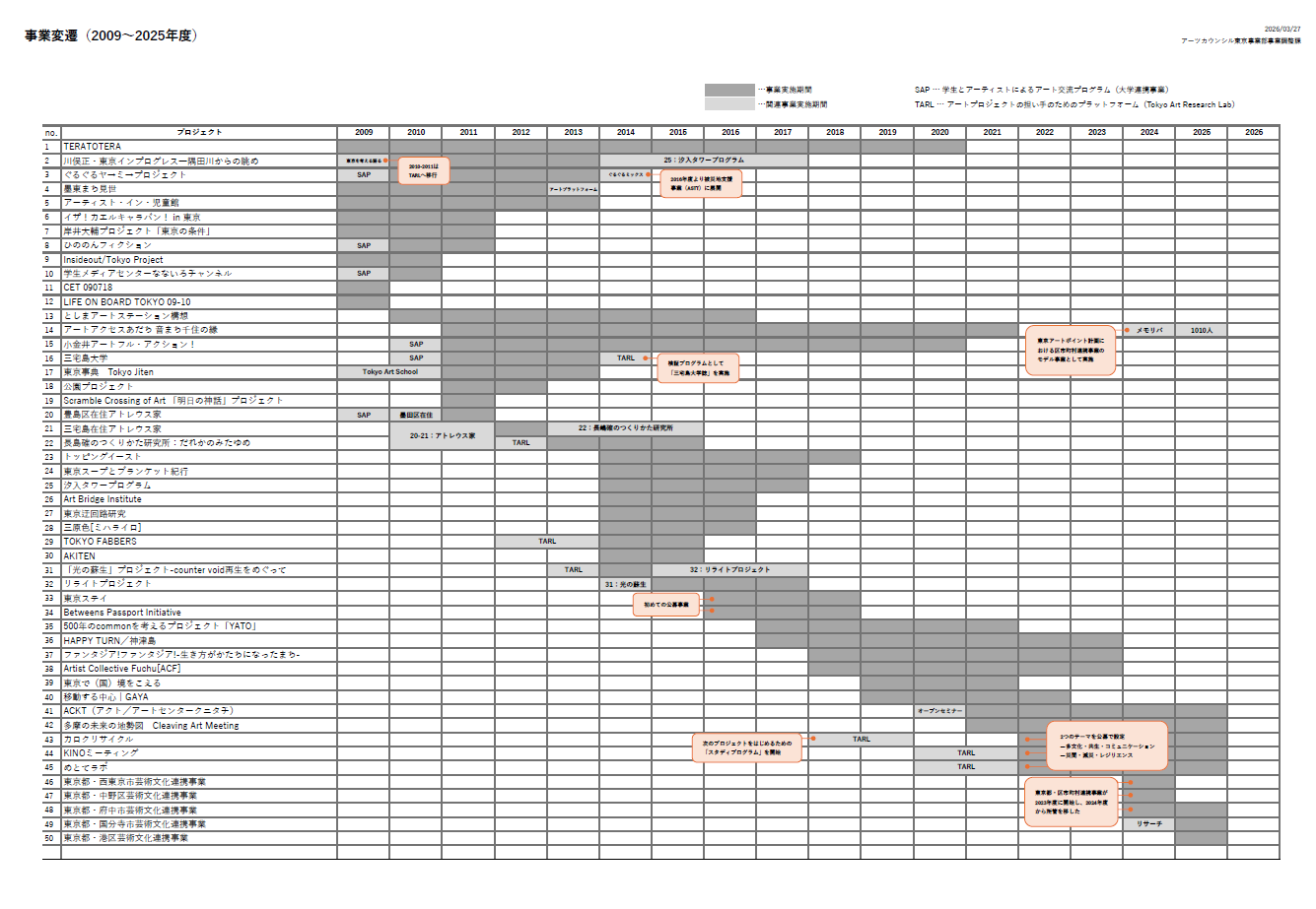 2025年1月、「年表を作る 2011年以降のアートプロジェクトを振り返る」の一環として、2022年度より制作を進めてきた年表をTARLウェブサイトにベータ版として公開。
