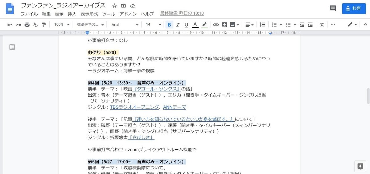 事務局内のコミュニケーションにおいても、会議の合間のおしゃべりや、同じ場所で一緒に作業することをとおして、ささいな気づきや細やかな情報共有を生みだし、時にはファンファンのプログラムのアイディアにも発展していました。しかし、コロナ禍でリアルに集まることができなくなり、「チーム内コミュニケーション、情報共有やリサーチの方法」に悩んでいたファンファン。5月、ある事務局メンバーの提案で生まれたのが、オンラインミーティング内で時間を設け、ラジオ番組風に情報共有をする企画「ラジオの時間」です。