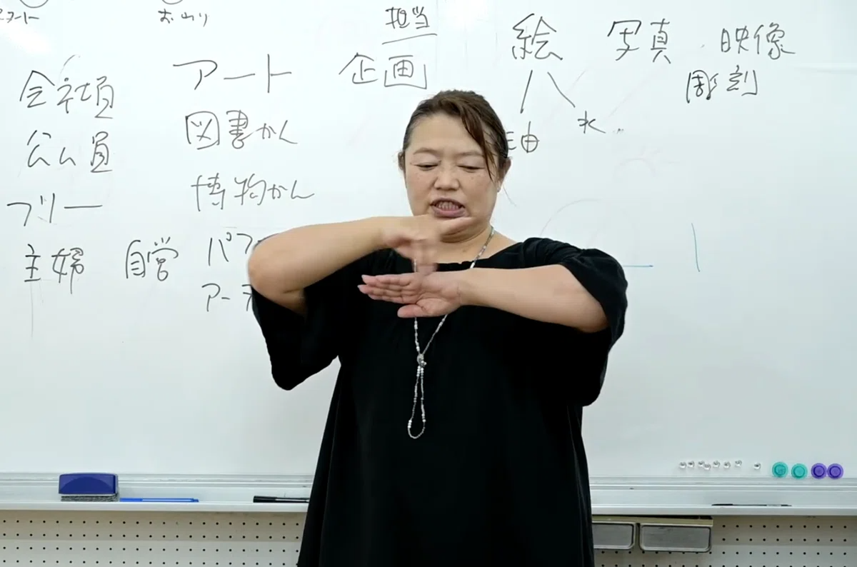 例えば、アート(=片手の手のひらに、もう片方の手の小指を当てて絵を描くようなイメージ)、映像(=映写機から投影された映像が目の前に立ち現れるイメージ)、アーティスト(=「アート」の手話を表した後、自分の体の両サイドをそっとなぞるような動作)、博物館(=おでこに両手を当てて開く動作+建物という手話=知識が開かれていく場所・建物というイメージ)、企画(=片方の手で狐の形をつくり、もう片方の肘から指先にかけてなぞって手前に折れる動作=紙を置いて書くイメージ)、担当(=右肩に右手を置いて肩を持つような動作=「責任」という手話にもなる)、サポート(=片手で親指を立てGOOD!の形をつくり、その後ろからもう片方の手のひらをそえて支える)etc…