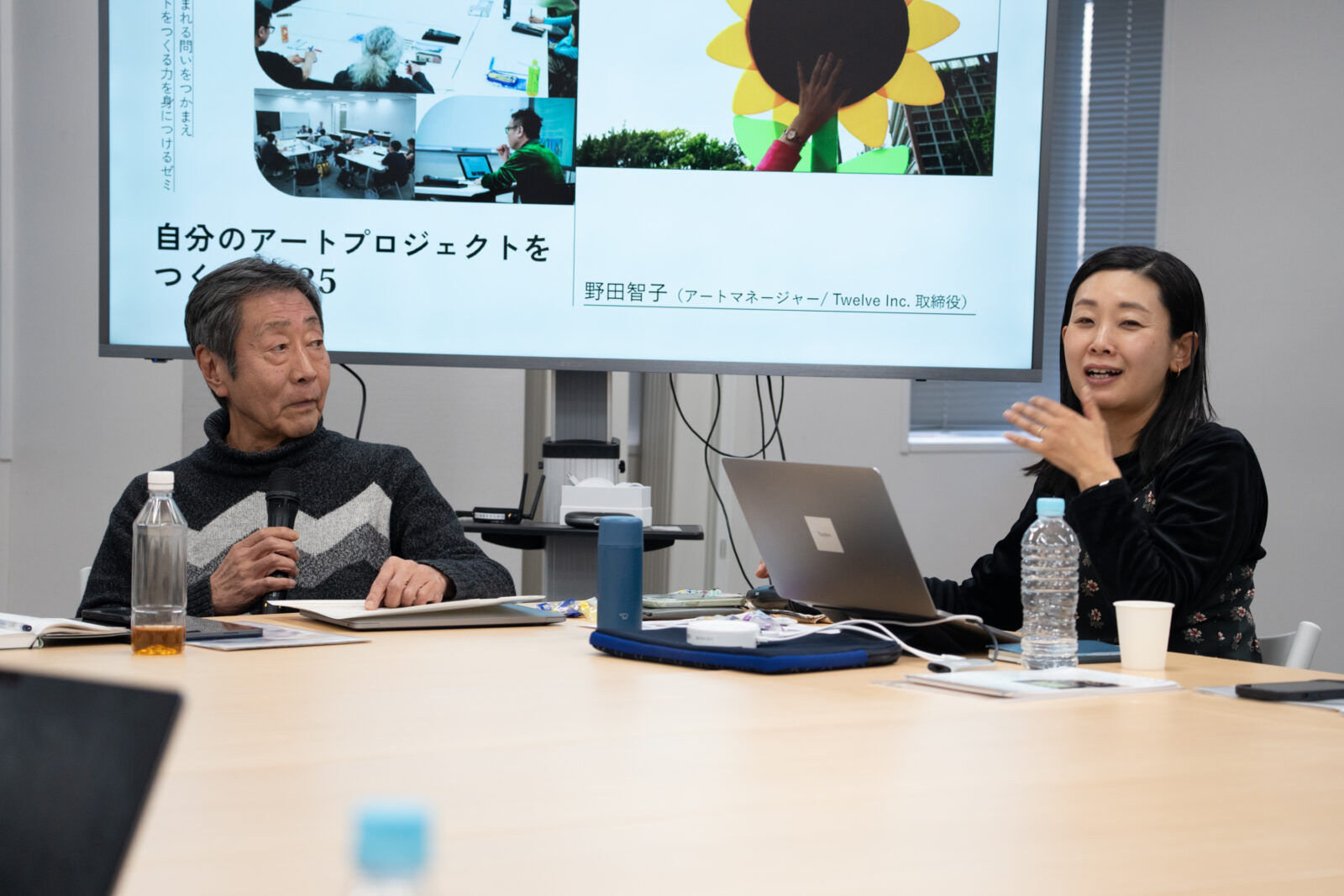 この演習では、アートプロジェクトをやりたいと思ったときに生まれる切実さをつかまえ言葉にすることができれば、たとえ実行の過程で何か困難なことが起きたとしても、原点に立ち返ることのできるブレない軸になるという考え方を共有してきました。受講生たちにとって、野田さんのレクチャーは、まさにこの「軸」があることの大切さや、それがあるからこその発展性、継続性を具体的な事例・角度から学ぶ機会になったのではないでしょうか。